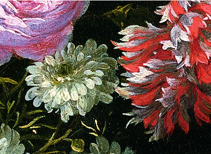 La riqueza del color es típica de la tradición franco-flamenca en la que se formó. También era parte del estilo de Monnoyer el combinar flores de gran corporeidad como las anémonas-coronarias con flores más delicadas como los jacintos.