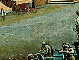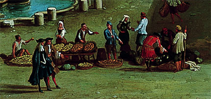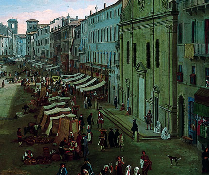La plaza era una de las más populosas de Roma. En este detalle se puede ver su uso como centro de intercambio, como mercado.