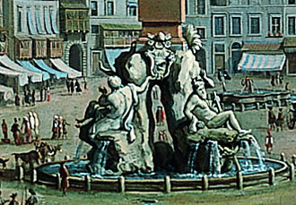 Esta fuente es la denominada de los Cuatro Ríos de Bernini, que se sitúa frente a la iglesia de Sant’Agnese in Agone que Borromini edificó junto al Palacio de los Pamphili remodelado por Rainaldi. La forma de la plaza obedece a la original del Circo Agonalis sobre el que se construyó.