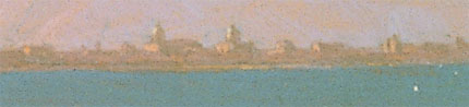 Aplicación muy pulida del celaje, con una tonalidad que va variando sutilmente consiguiendo así el ambiente brumoso mediterráneo que se superpone a la descripción rigurosa de la topografía. La atmósfera y no la narración era lo que más interesaba a Gifford.
