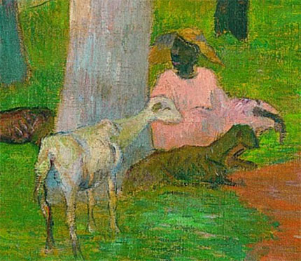 En el verde oscuro del árbol destacan toques de bermellón que nos hacen intuir las frutas que maduraban en los árboles.